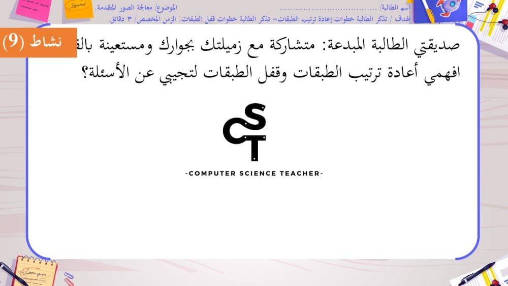 الحقوق محفوظة لحساب معلم علوم الحاسب ولا يحق للعميل نشر رابط العرض ولا تزويد الآخرين به دون دفع قيمة النسخة حتى لا يقع تحت طائلة المساءلة بقية الحقوق مرفقة بالعرض وفي صورة العينات