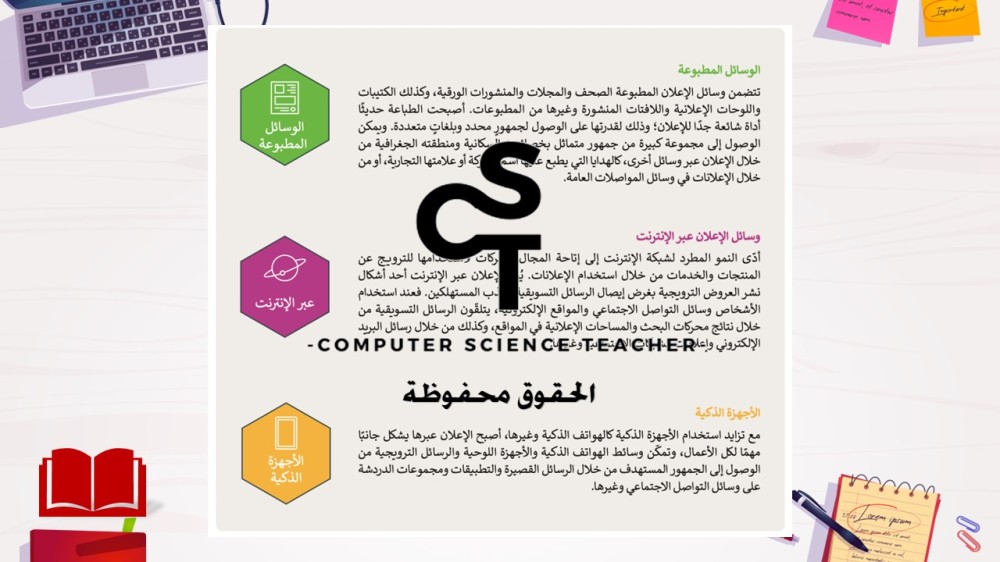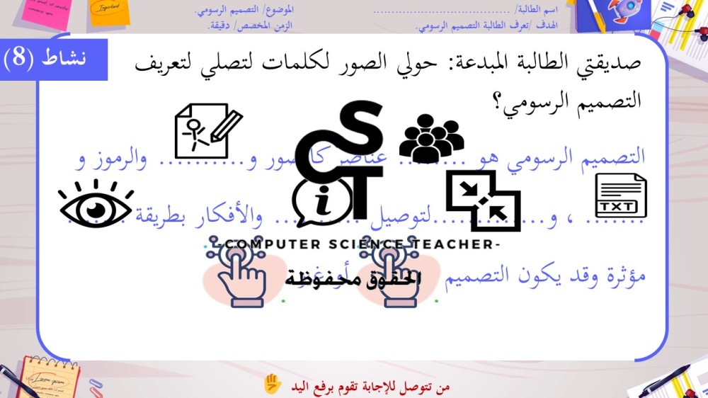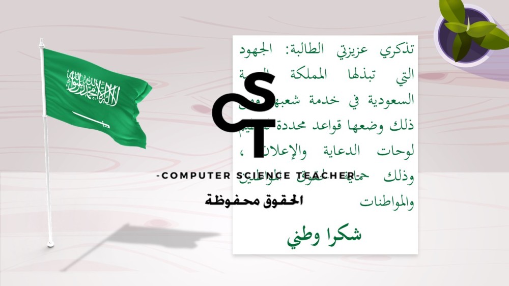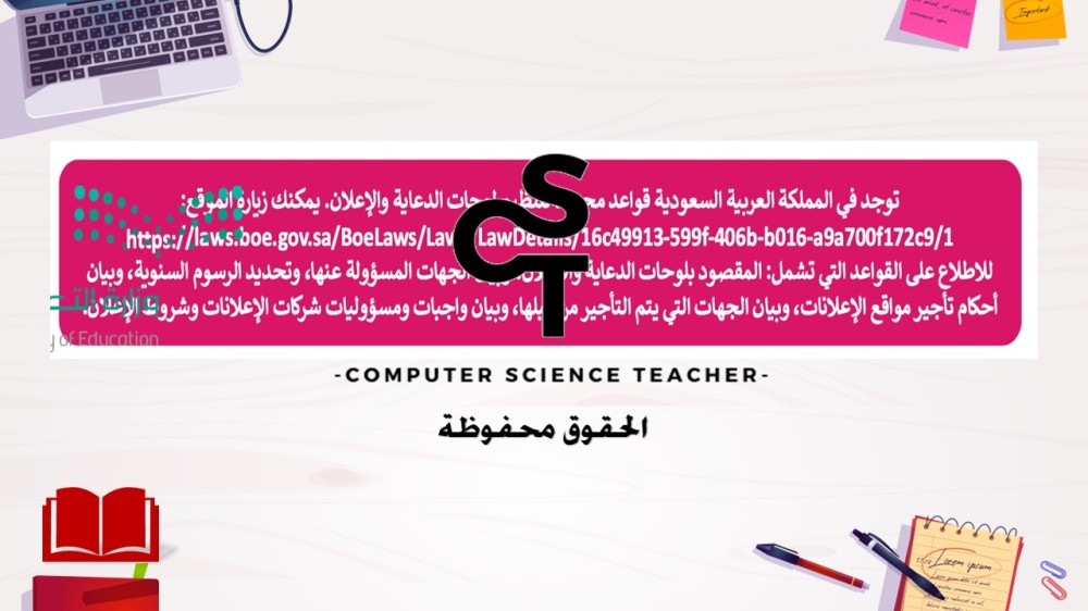 الحقوق محفوظة لحساب معلم علوم الحاسب ولا يحق للعميل نشر رابط العرض ولا تزويد الآخرين به دون دفع قيمة النسخة حتى لا يقع تحت طائلة المساءلة بقية الحقوق مرفقة بالعرض وفي صورة العينات