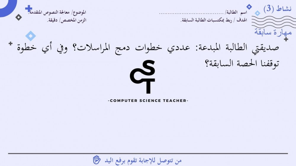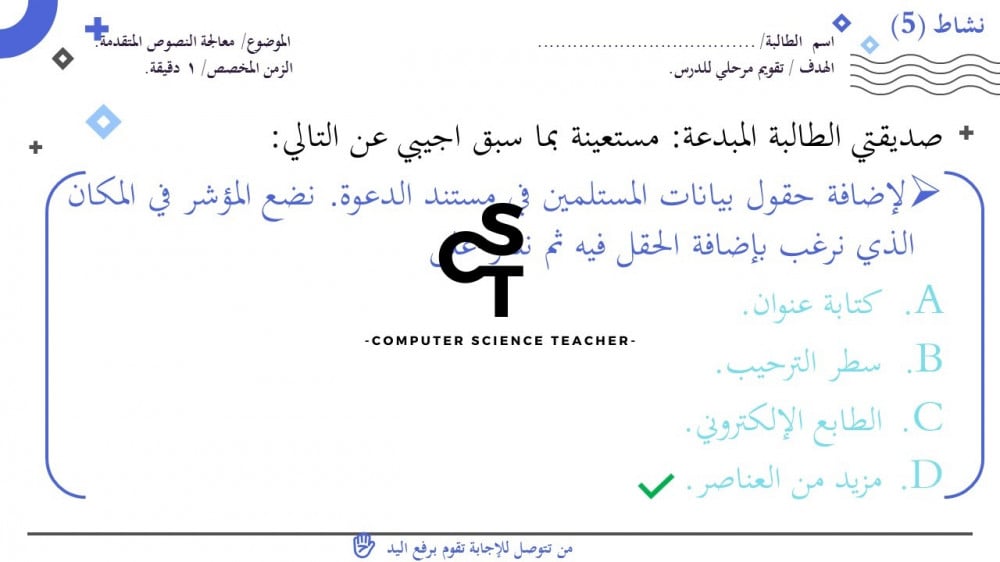 الحقوق محفوظة لحساب معلم علوم الحاسب ولا يحق للعميل نشر رابط العرض ولا تزويد الآخرين به دون دفع قيمة النسخة حتى لا يقع تحت طائلة المساءلة بقية الحقوق مرفقة بالعرض وفي صورة العينات