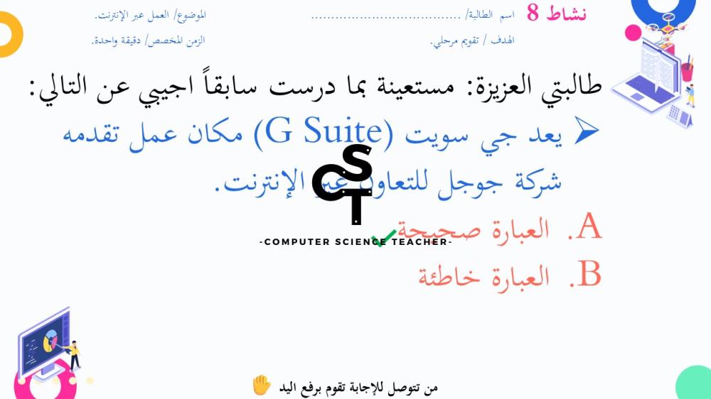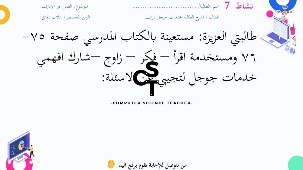 الحقوق محفوظة لحساب معلم علوم الحاسب ولا يحق للعميل نشر رابط العرض ولا تزويد الآخرين به دون دفع قيمة النسخة حتى لا يقع تحت طائلة المساءلة بقية الحقوق مرفقة بالعرض وفي صورة العينات