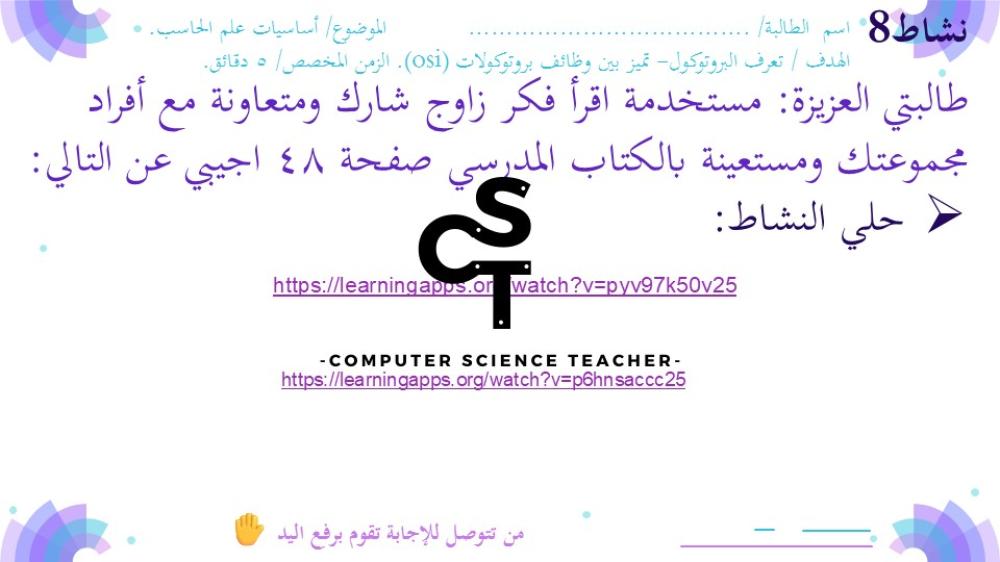الحقوق محفوظة لحساب معلم علوم الحاسب ولا يحق للعميل نشر رابط العرض ولا تزويد الآخرين به دون دفع قيمة النسخة حتى لا يقع تحت طائلة المساءلة بقية الحقوق مرفقة بالعرض وفي صورة العينات