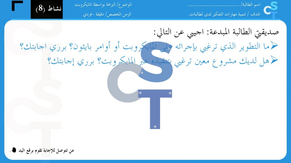 الحقوق محفوظة لحساب معلم علوم الحاسب ولا يحق للعميل نشر رابط العرض ولا تزويد الآخرين به دون دفع قيمة النسخة حتى لا يقع تحت طائلة المساءلة بقية الحقوق مرفقة بالعرض وفي صورة العينات