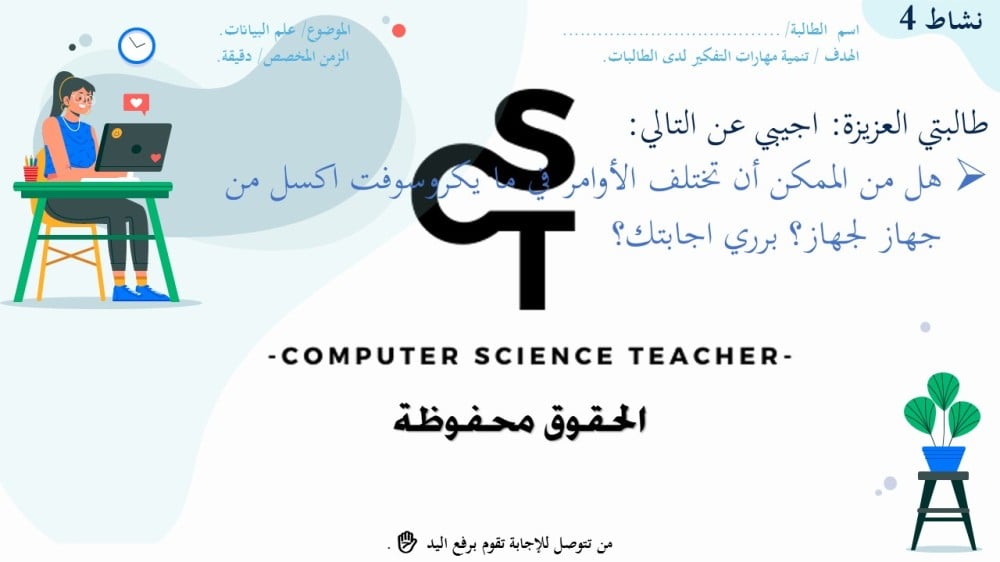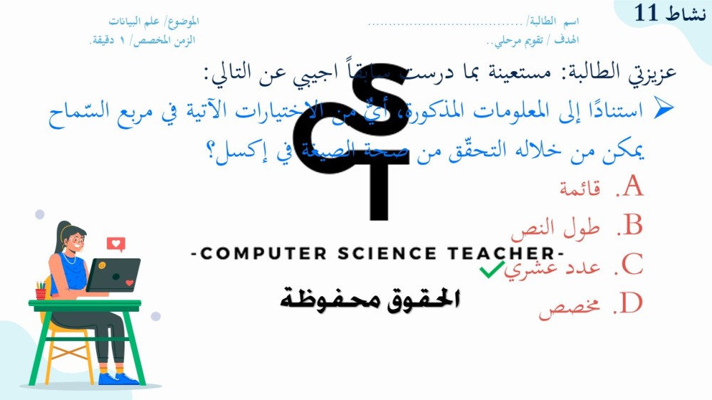 الحقوق محفوظة لحساب معلم علوم الحاسب ولا يحق للعميل نشر رابط العرض ولا تزويد الآخرين به دون دفع قيمة النسخة حتى لا يقع تحت طائلة المساءلة بقية الحقوق مرفقة بالعرض وفي صورة العينات