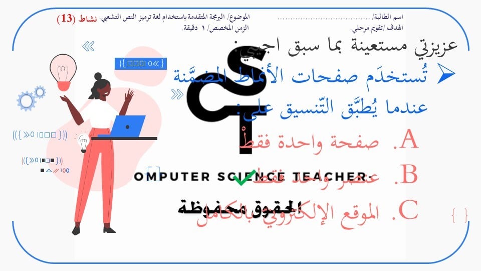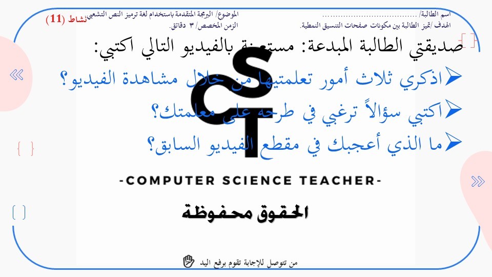 الحقوق محفوظة لحساب معلم علوم الحاسب ولا يحق للعميل نشر رابط العرض ولا تزويد الآخرين به دون دفع قيمة النسخة حتى لا يقع تحت طائلة المساءلة بقية الحقوق مرفقة بالعرض وفي صورة العينات