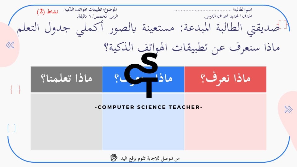 الحقوق محفوظة لحساب معلم علوم الحاسب ولا يحق للعميل نشر رابط العرض ولا تزويد الآخرين به دون دفع قيمة النسخة حتى لا يقع تحت طائلة المساءلة بقية الحقوق مرفقة بالعرض وفي صورة العينات