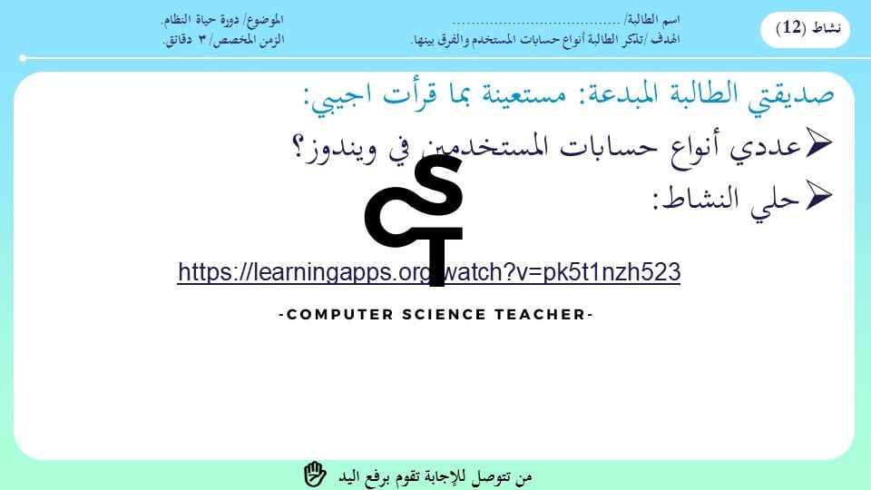 الحقوق محفوظة لحساب معلم علوم الحاسب ولا يحق للعميل نشر رابط العرض ولا تزويد الآخرين به دون دفع قيمة النسخة حتى لا يقع تحت طائلة المساءلة بقية الحقوق مرفقة بالعرض وفي صورة العينات