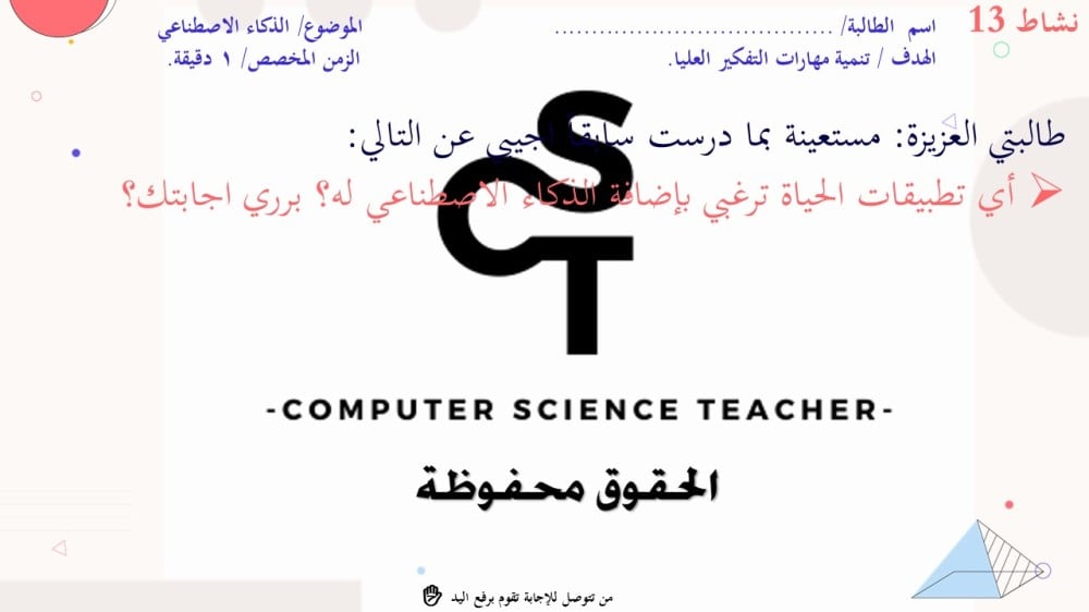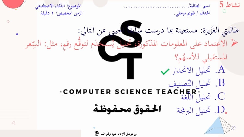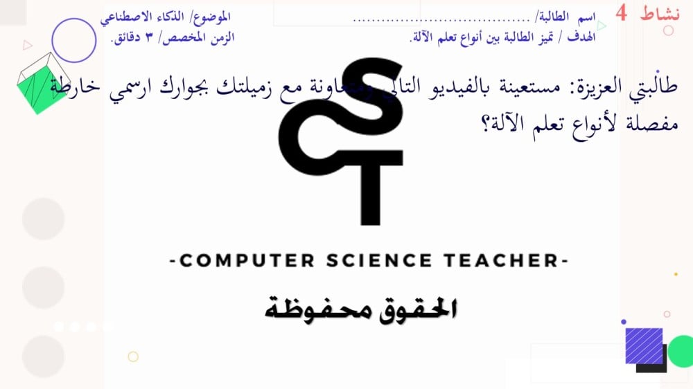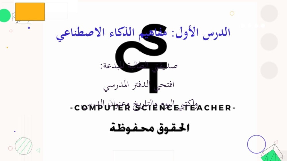 الحقوق محفوظة لحساب معلم علوم الحاسب ولا يحق للعميل نشر رابط العرض ولا تزويد الآخرين به دون دفع قيمة النسخة حتى لا يقع تحت طائلة المساءلة بقية الحقوق مرفقة بالعرض وفي صورة العينات