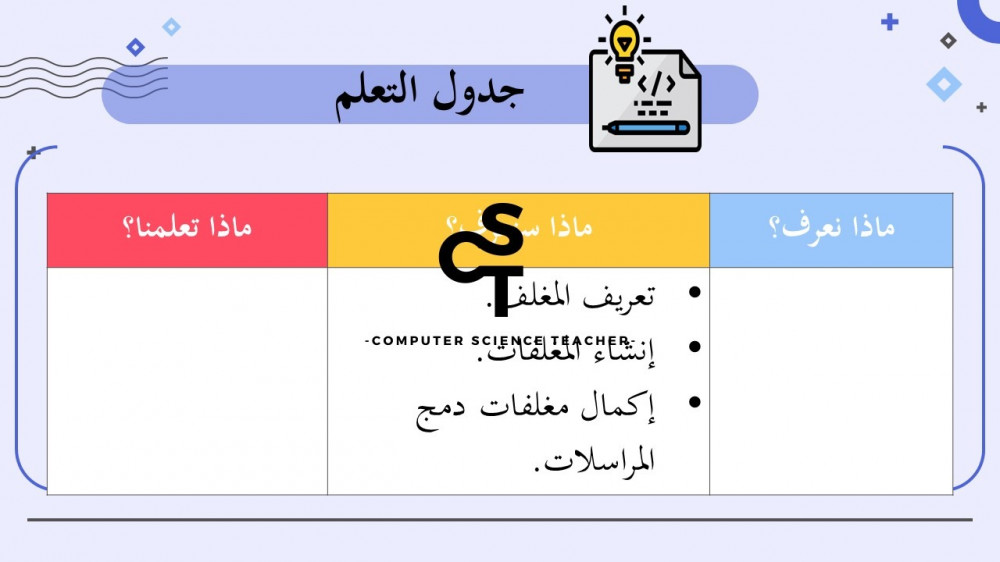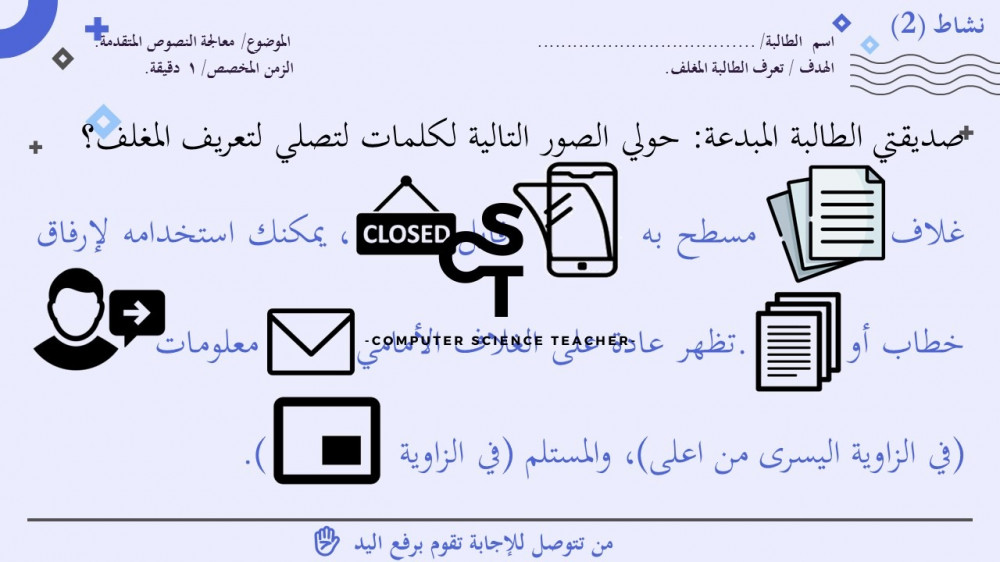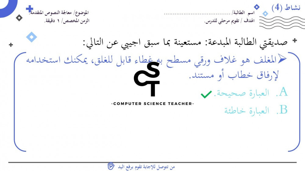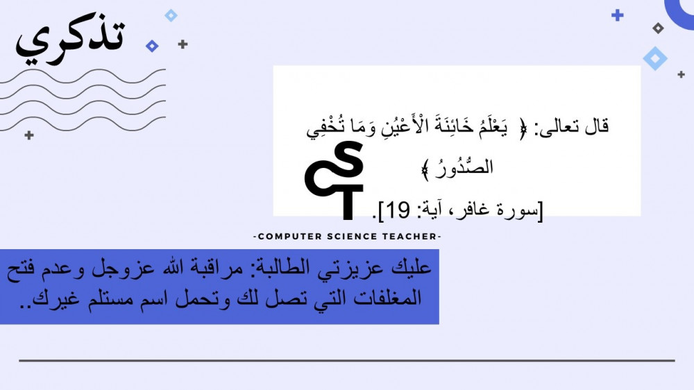 الحقوق محفوظة لحساب معلم علوم الحاسب ولا يحق للعميل نشر رابط العرض ولا تزويد الآخرين به دون دفع قيمة النسخة حتى لا يقع تحت طائلة المساءلة بقية الحقوق مرفقة بالعرض وفي صورة العينات