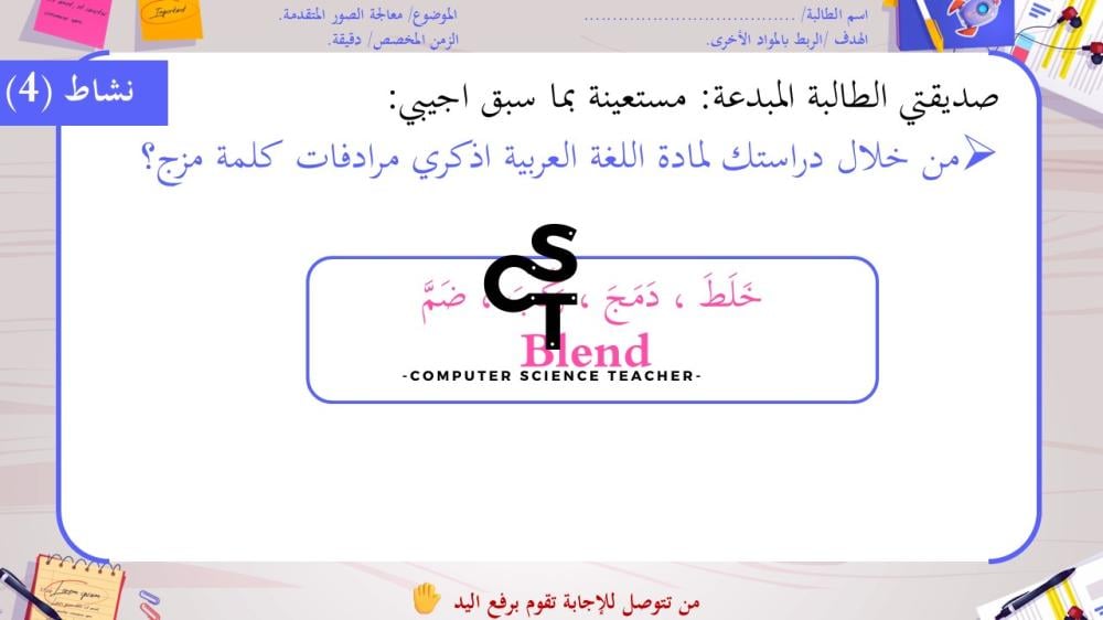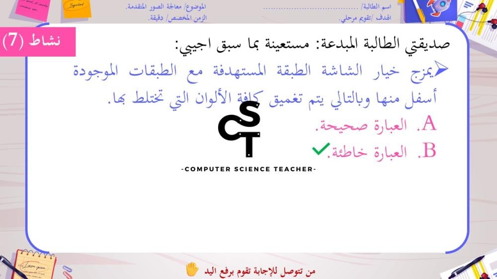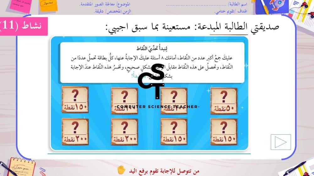 الحقوق محفوظة لحساب معلم علوم الحاسب ولا يحق للعميل نشر رابط العرض ولا تزويد الآخرين به دون دفع قيمة النسخة حتى لا يقع تحت طائلة المساءلة بقية الحقوق مرفقة بالعرض وفي صورة العينات