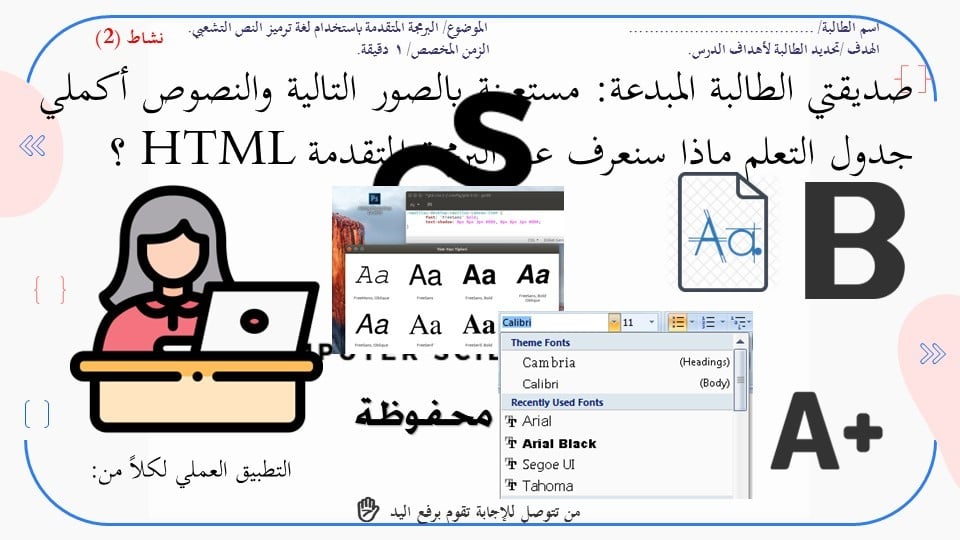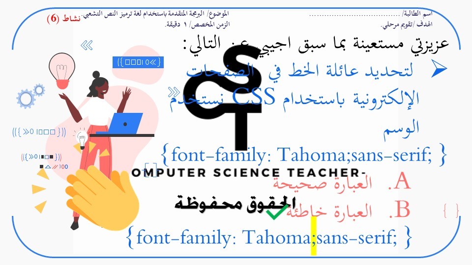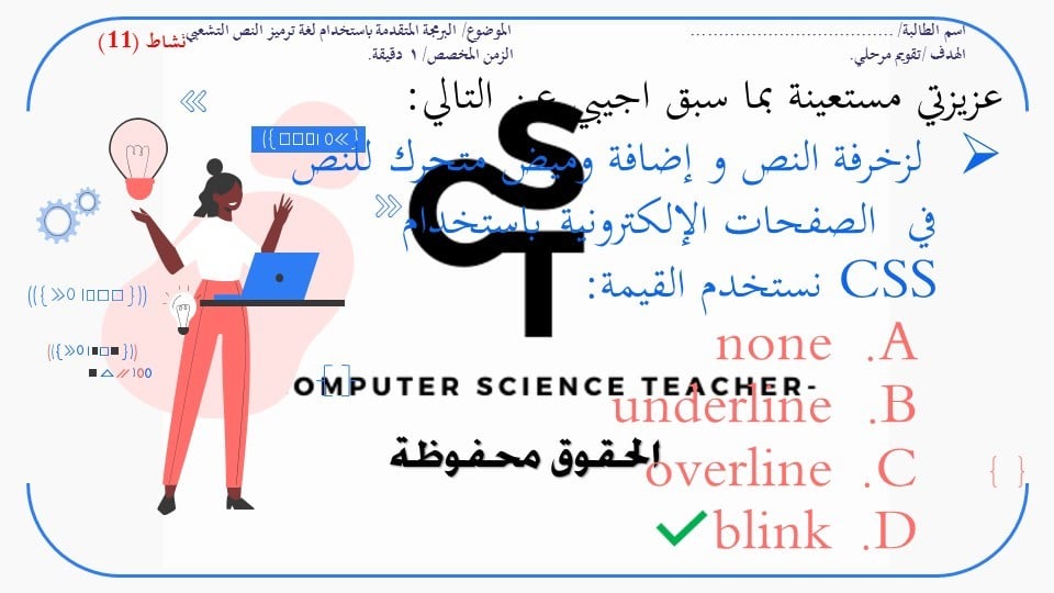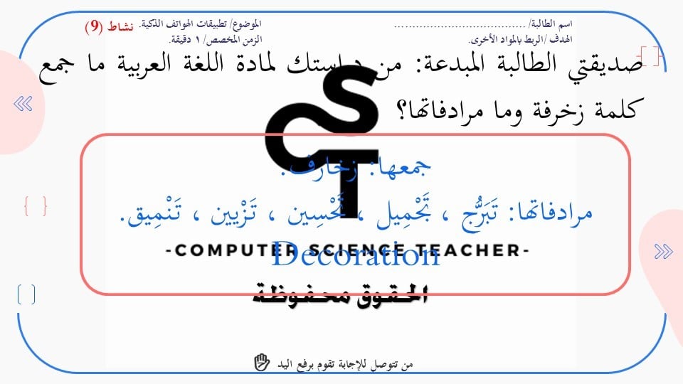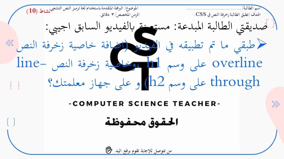 الحقوق محفوظة لحساب معلم علوم الحاسب ولا يحق للعميل نشر رابط العرض ولا تزويد الآخرين به دون دفع قيمة النسخة حتى لا يقع تحت طائلة المساءلة بقية الحقوق مرفقة بالعرض وفي صورة العينات