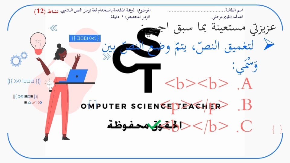 الحقوق محفوظة لحساب معلم علوم الحاسب ولا يحق للعميل نشر رابط العرض ولا تزويد الآخرين به دون دفع قيمة النسخة حتى لا يقع تحت طائلة المساءلة بقية الحقوق مرفقة بالعرض وفي صورة العينات