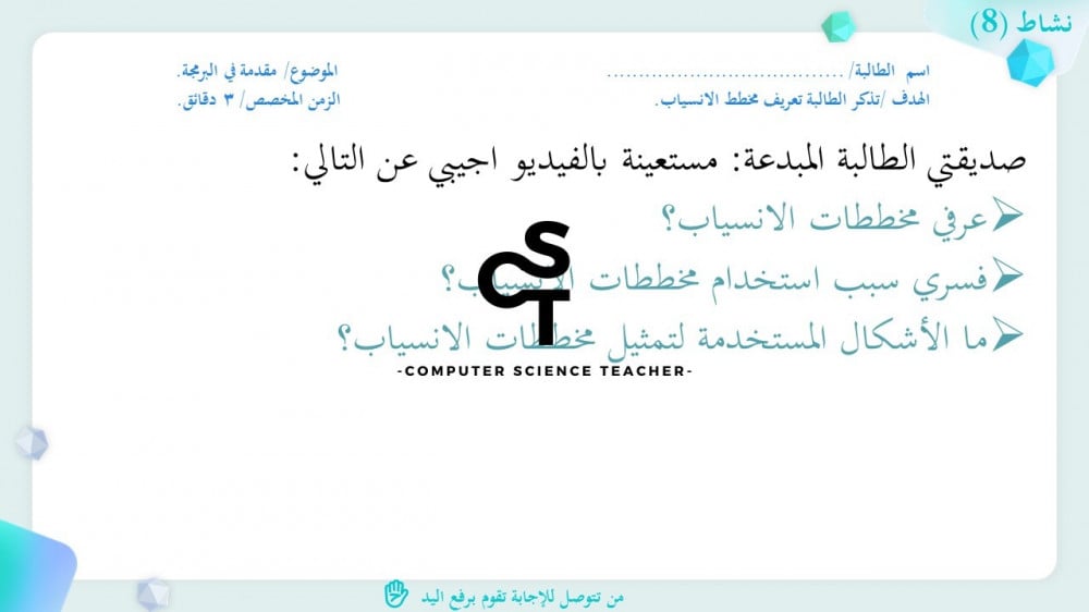 الحقوق محفوظة لحساب معلم علوم الحاسب ولا يحق للعميل نشر رابط العرض ولا تزويد الآخرين به دون دفع قيمة النسخة حتى لا يقع تحت طائلة المساءلة بقية الحقوق مرفقة بالعرض وفي صورة العينات