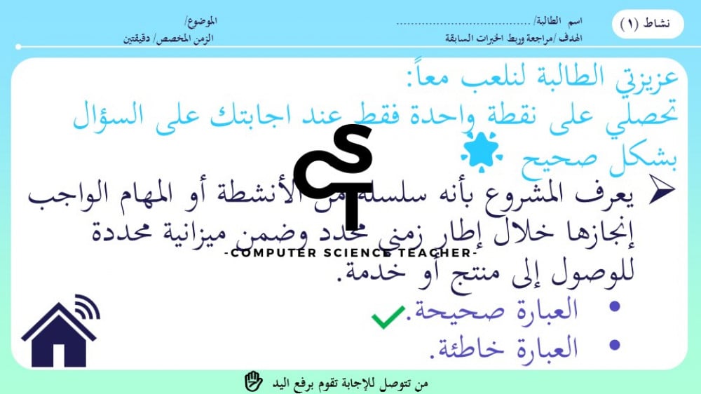 الحقوق محفوظة لحساب معلم علوم الحاسب ولا يحق للعميل نشر رابط العرض ولا تزويد الآخرين به دون دفع قيمة النسخة حتى لا يقع تحت طائلة المساءلة بقية الحقوق مرفقة بالعرض وفي صورة العينات