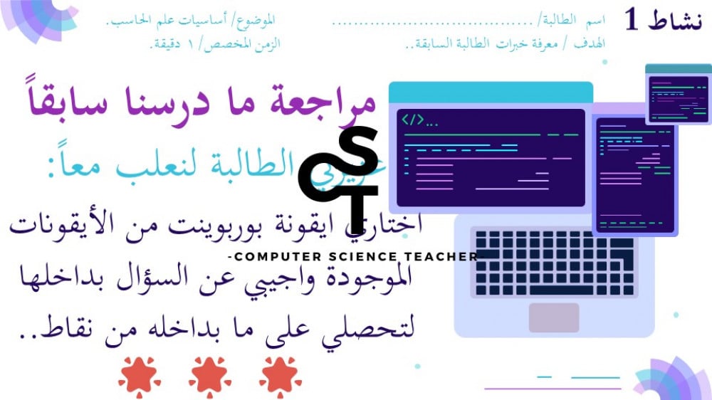 الحقوق محفوظة لحساب معلم علوم الحاسب ولا يحق للعميل نشر رابط العرض ولا تزويد الآخرين به دون دفع قيمة النسخة حتى لا يقع تحت طائلة المساءلة بقية الحقوق مرفقة بالعرض وفي صورة العينات